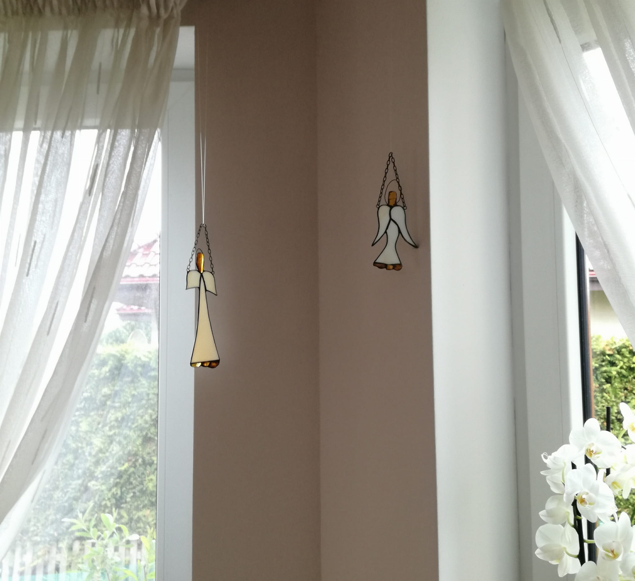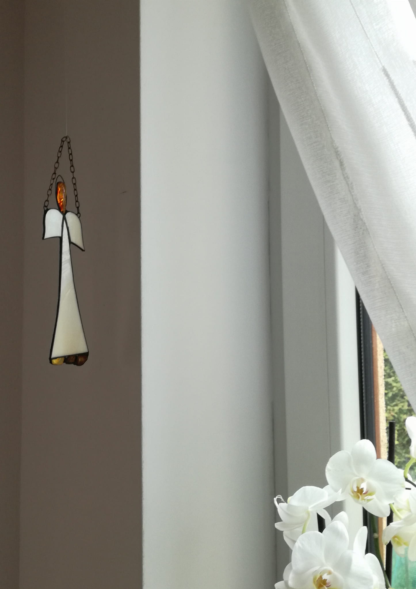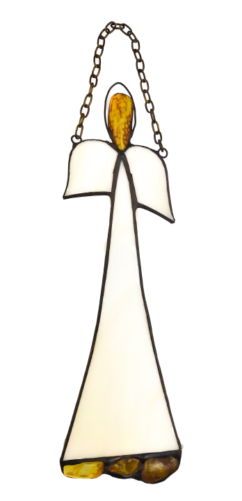 Aniołek wysoki wykonany ręcznie metodą witrażową ze szkła witrażowego i bursztynu bałtyckiego. Wysokość całkowita aniołka z łańcuszkiem 24 cm, bez łańcuszka 19 cm, szerokość ok 6 cm. Nasz sklep Bursztynowyprezent.pl gwarantuje najwyższą jakość wykonanych wyrobów. Zapraszamy na zakupy, kupując u nas wspierasz polskie firmy!