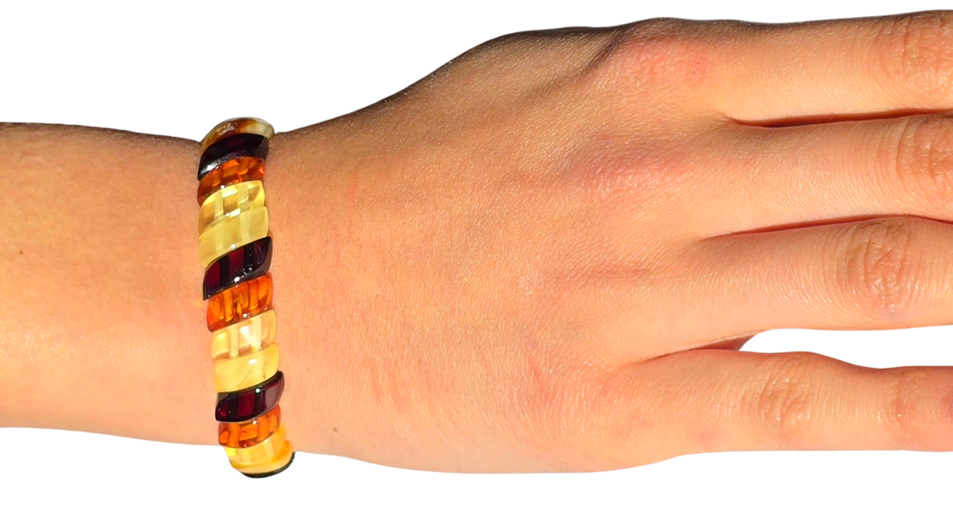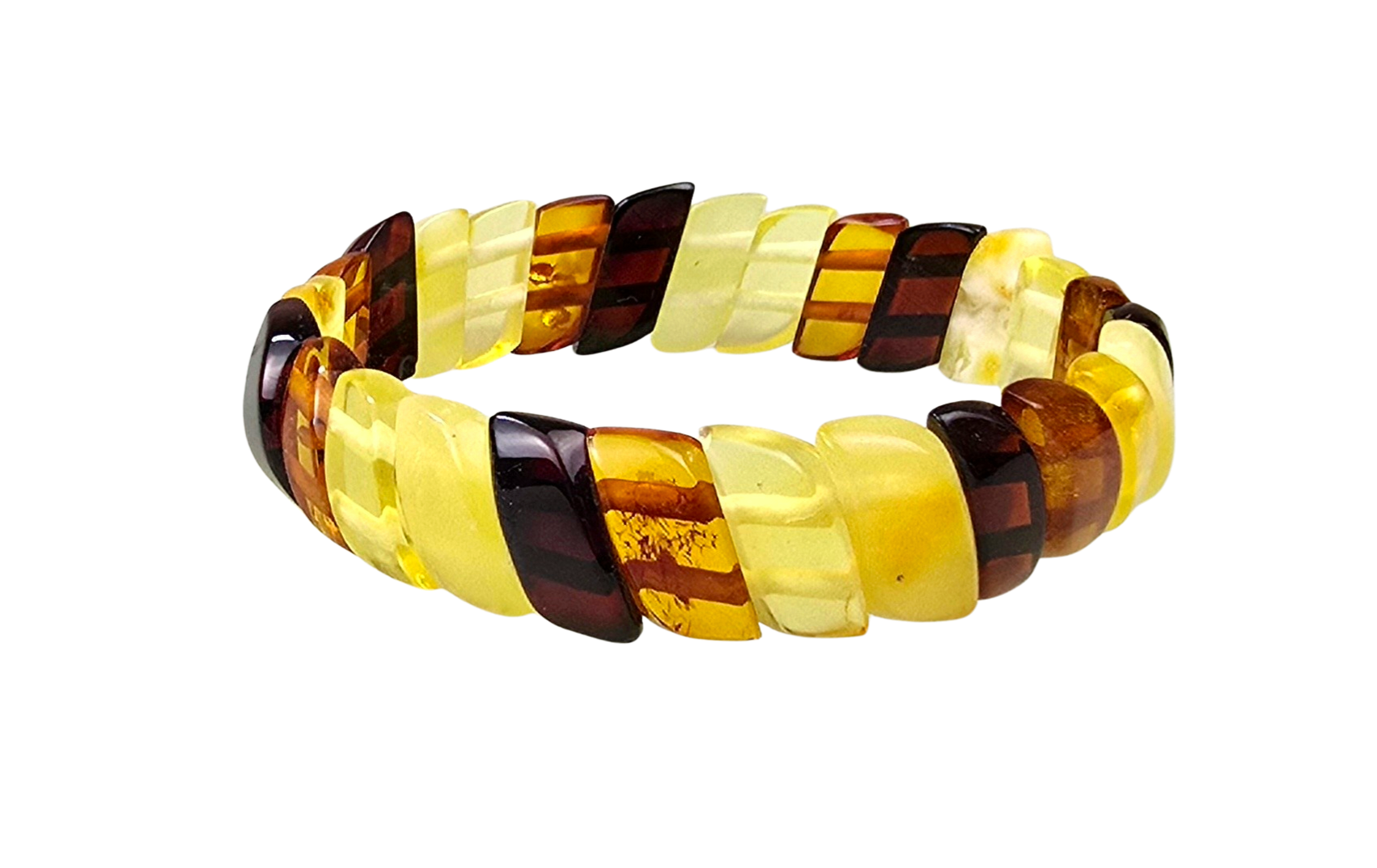 - Bursztyny użyte do wykonania bransoletki są różnokolorowe.