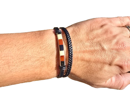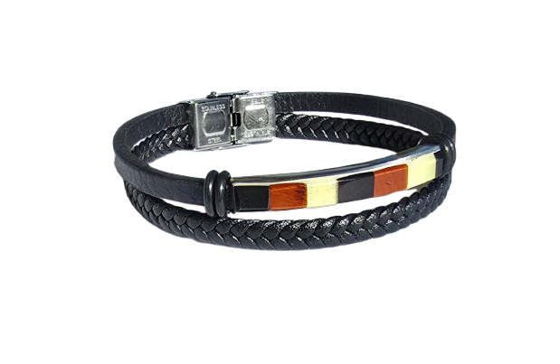 Bransoletka skórzana męska z bursztynami i zapięciem ze stali