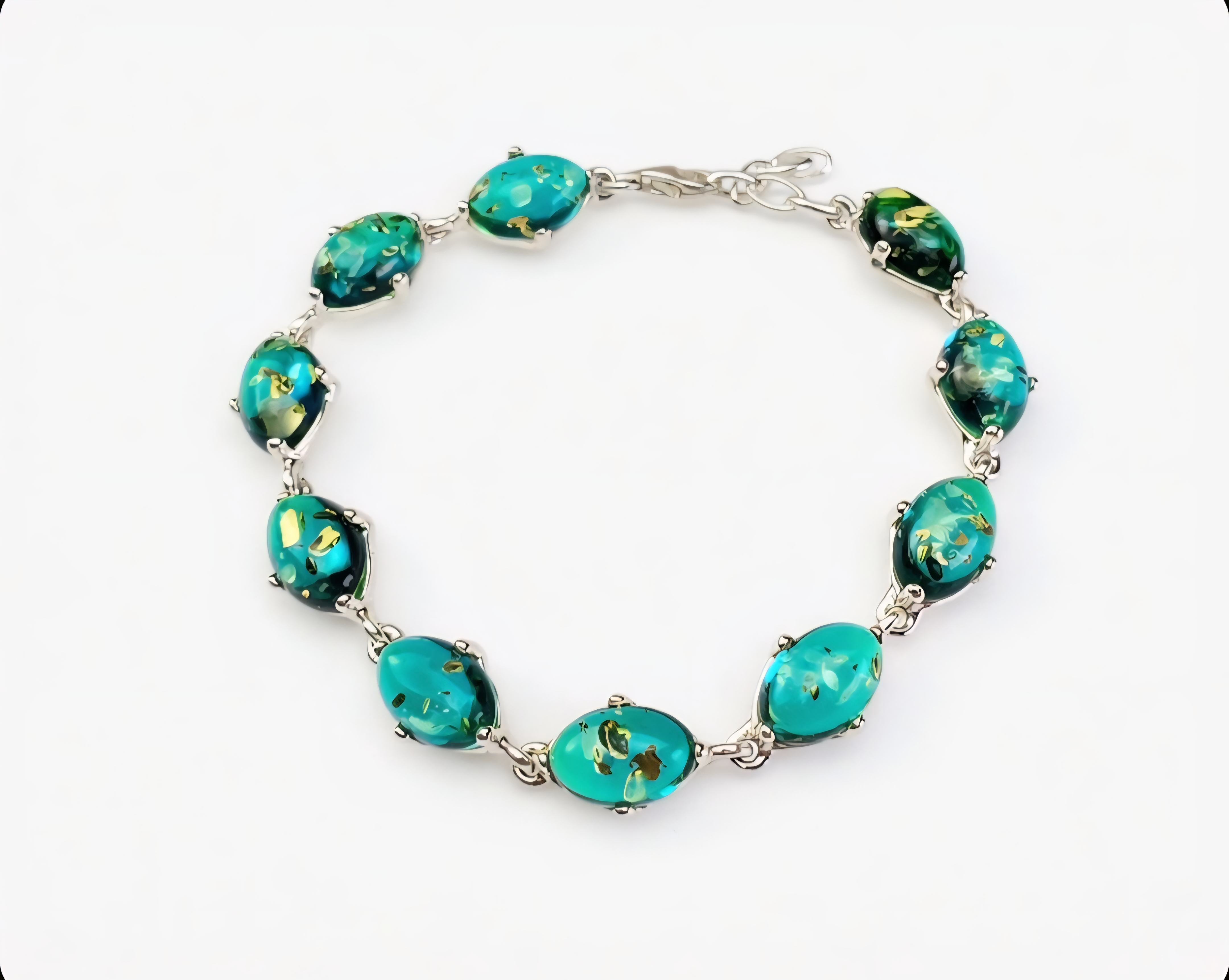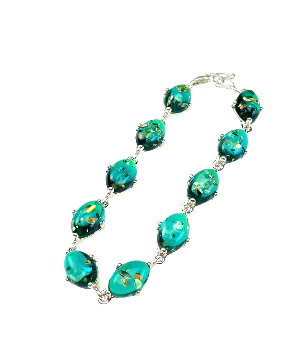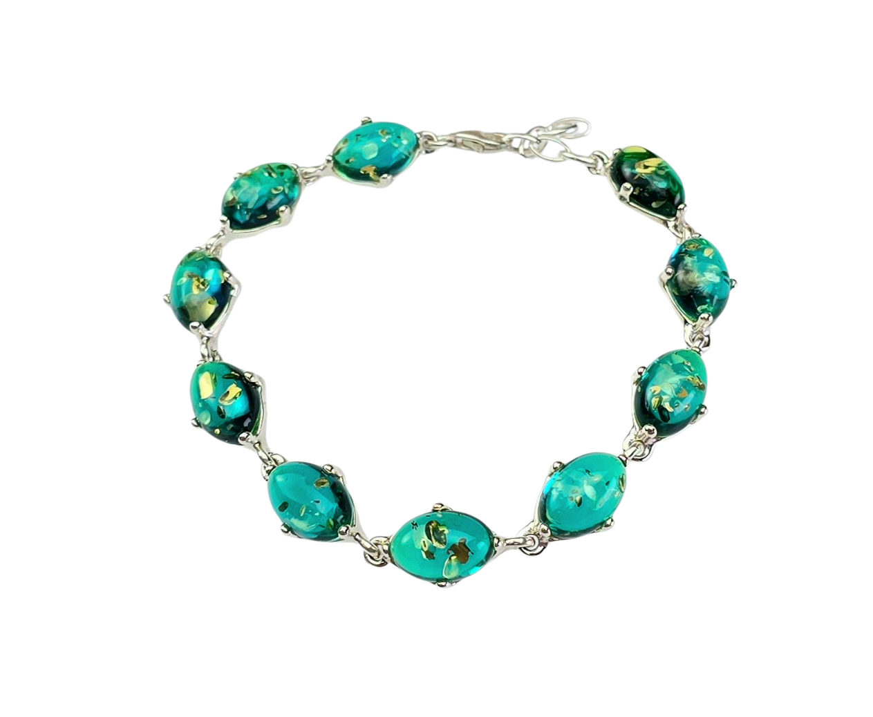Przepiękna i unikatowa bransoletka z bursztynami koloru turkus morski w oprawie ze srebra próby 925. Bransoletkę wykonał ręcznie mistrz bursztynnictwa z Gdyni.