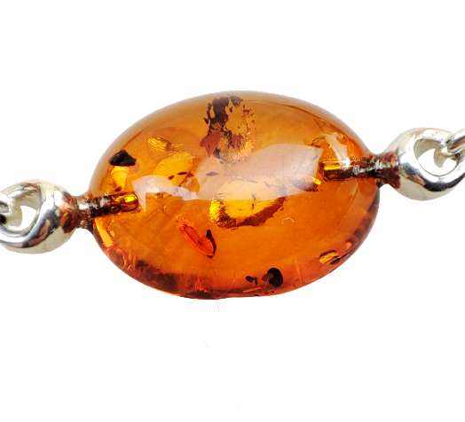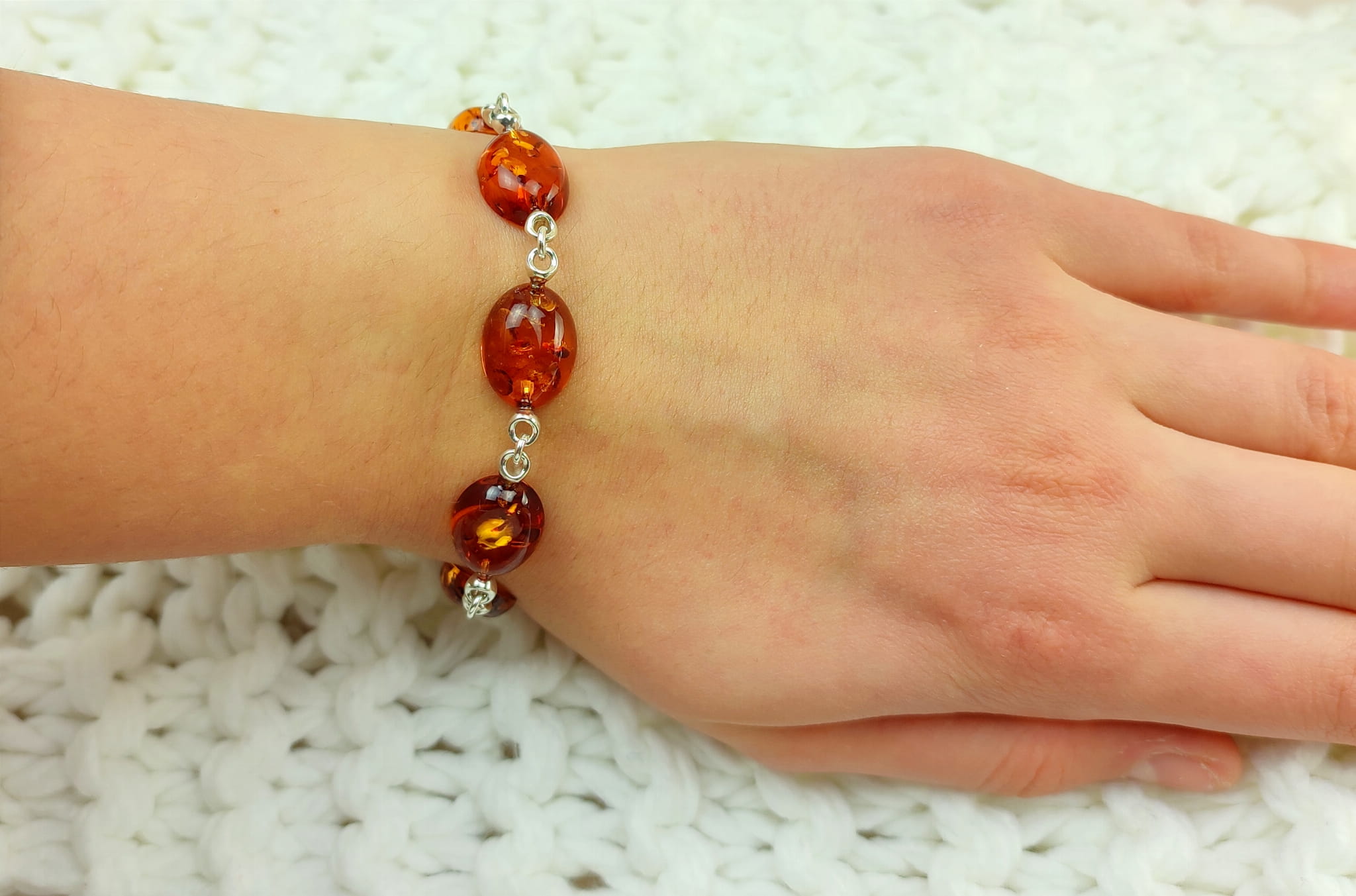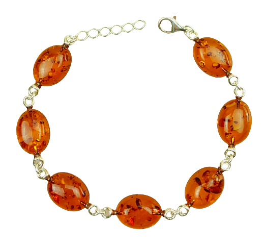Ta cudowna bransoletka jest wykonana z naturalnego bursztynu bałtyckiego i srebra próby 925. Bransoletka posiada bardzo solidne, karabinkowe zapięcie i regulacje długości. Bursztyny są koloru koniakowego.