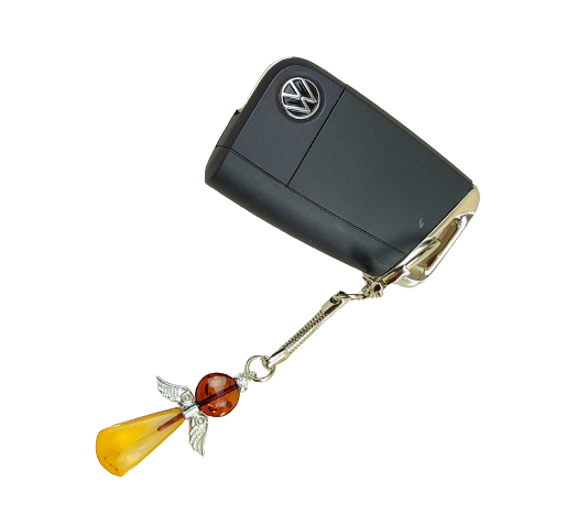 Brelok do kluczy zdobiony aniołkiem z bursztynu
