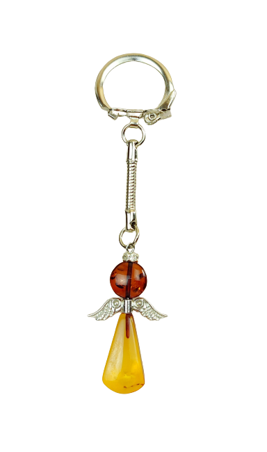 - Breloczek wykonany jest z polerowanego naturalnego bursztynu bałtyckiego w kształcie anioła i metalowego zapięcia na klucze.