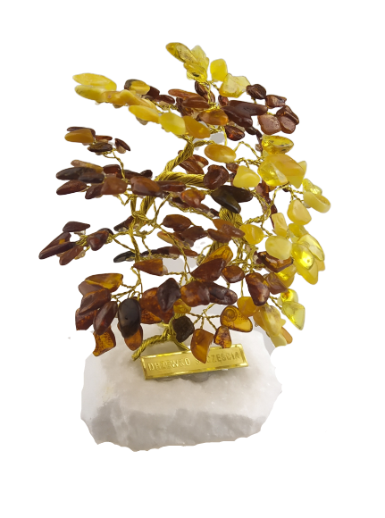 Oferowane przez nasz sklep drzewko szczęścia wykonane jest ręcznie z bursztynu bałtyckiego na marmurowej podstawie, gałęzie i pień uformowane są z mosiężnego drutu.