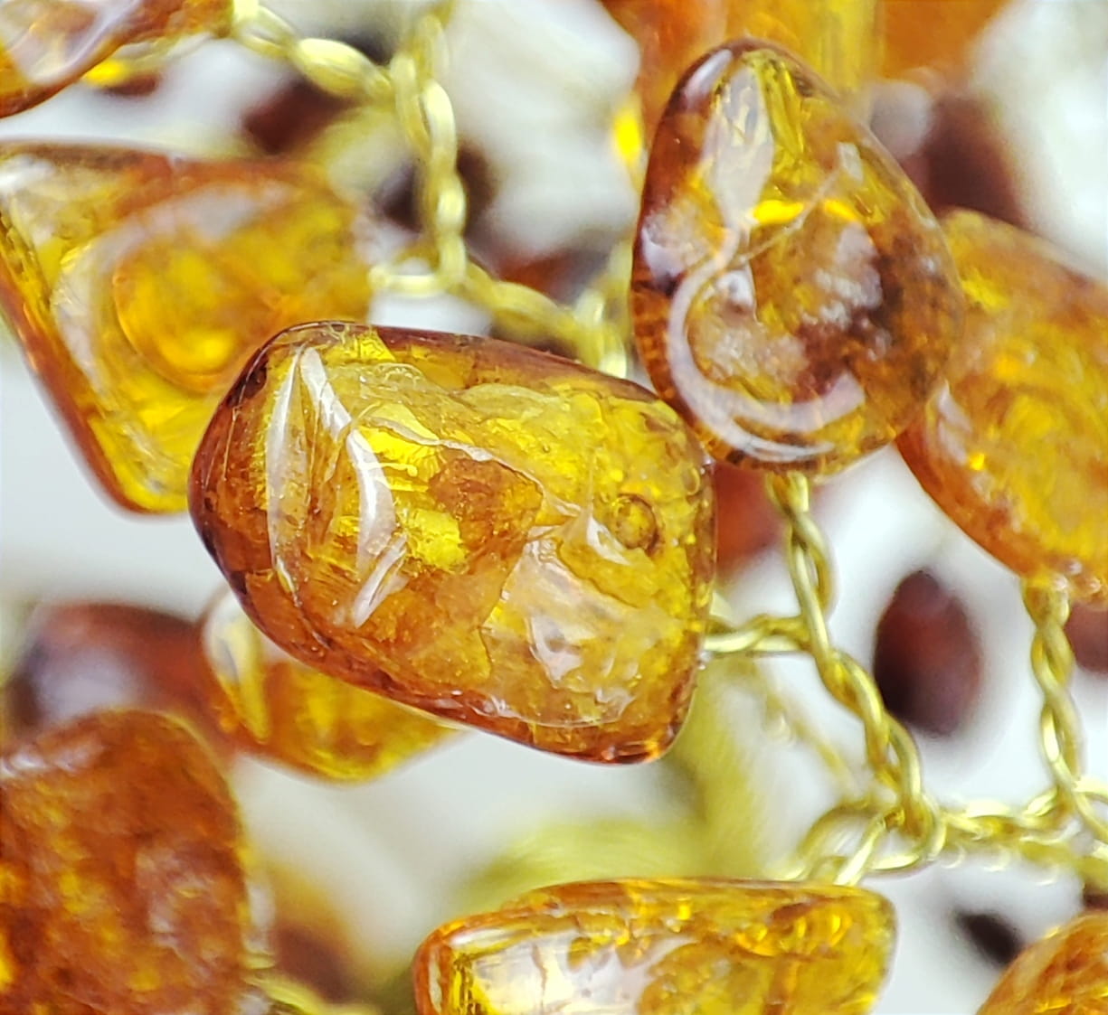 To piękne drzewko szczęścia jest wykonane ręcznie z bursztynu bałtyckiego, mosiężnego drutu uformowanego w kształt gałęzi i przymocowanego do drewnianej podstawki.