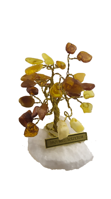 Bursztynowe drzewko szczęścia z żółto-mlecznymi listkami.