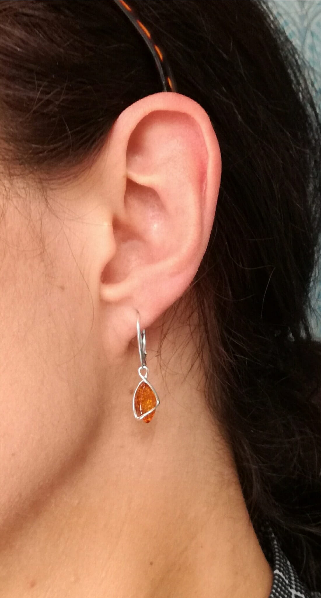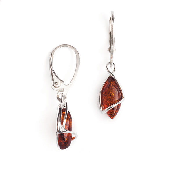 - Bursztyn zdobiący kolczyki jest koloru koniakowego.