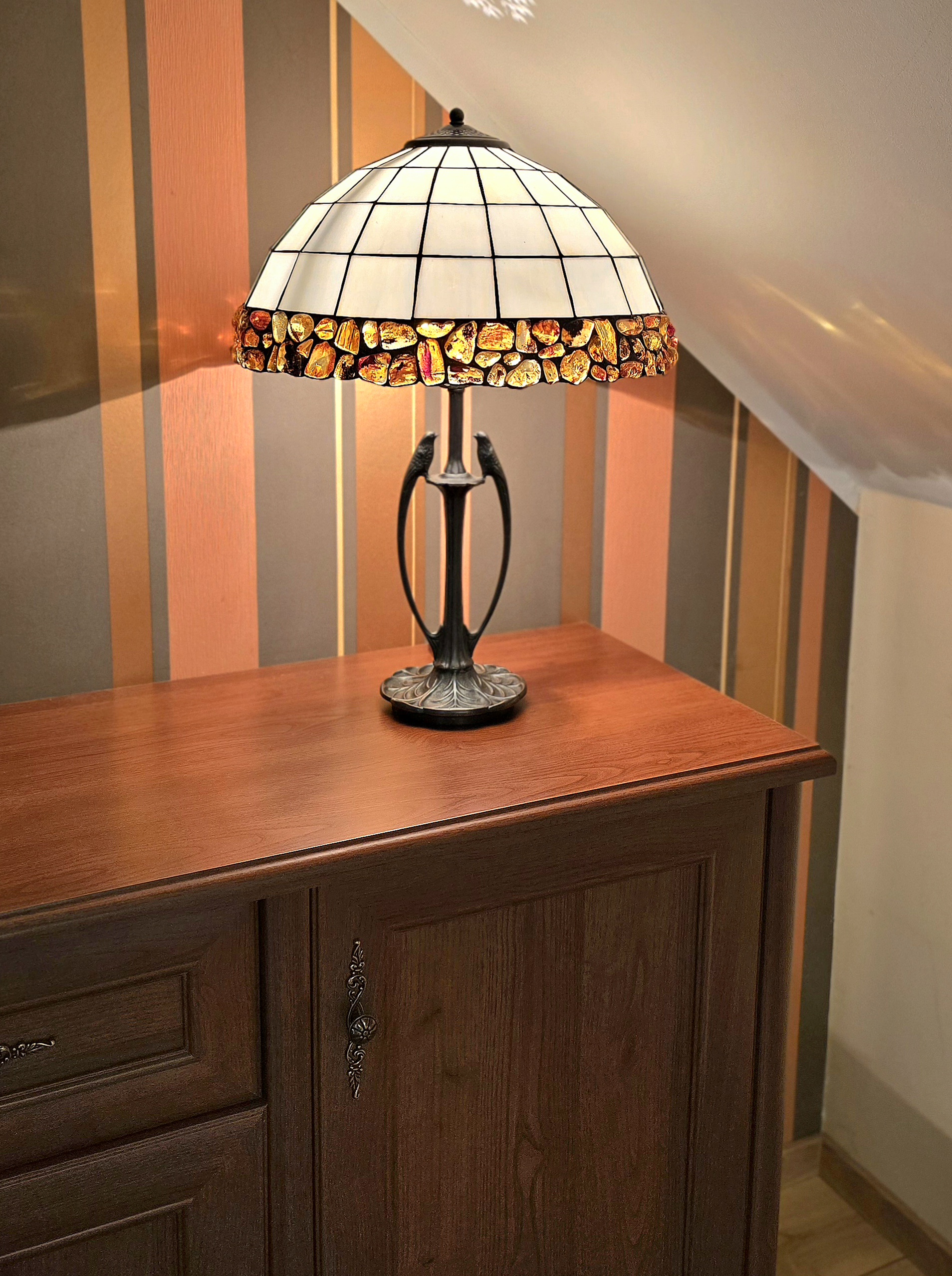 Oferujemy Państwu wyjątkową i oryginalną lampę, która została wykonywana ręcznie z bursztynu bałtyckiego i szkła witrażowego metodą Tiffaniego w naszej pracowni w Gdyni.