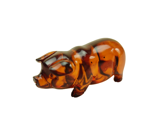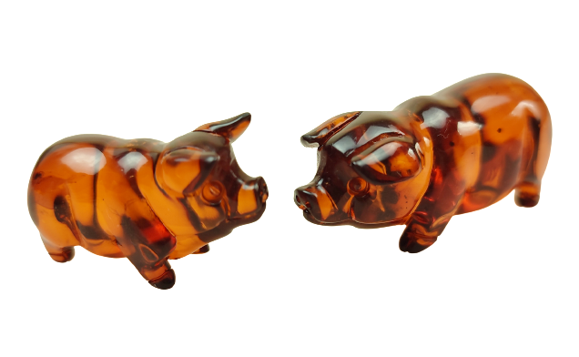 Oferujemy Państwu niepowtarzalne rękodzieło, dwie świnki wyrzeżbione każda z jednej bryłki bursztynu bałtyckiego. Nasza rzeżba została wykonana przez gdańskiego bursztynnika z dbałością o każdy szczegół.