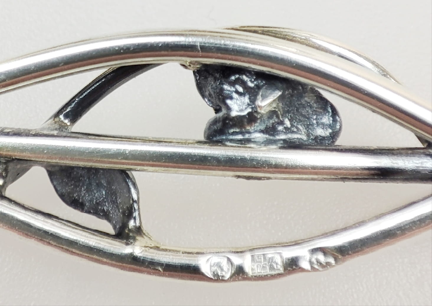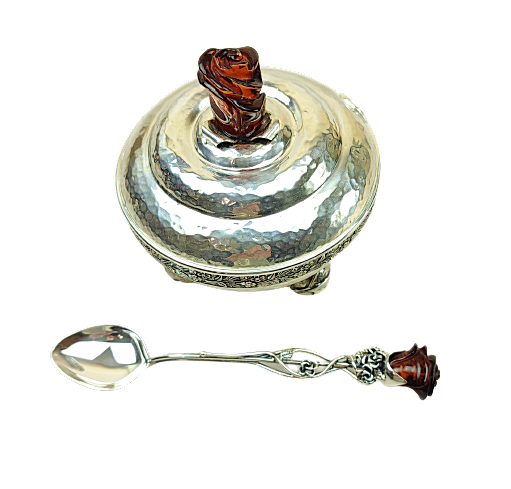 Srebrna cukiernica z łyżeczką zdobione bursztynową różą
