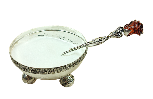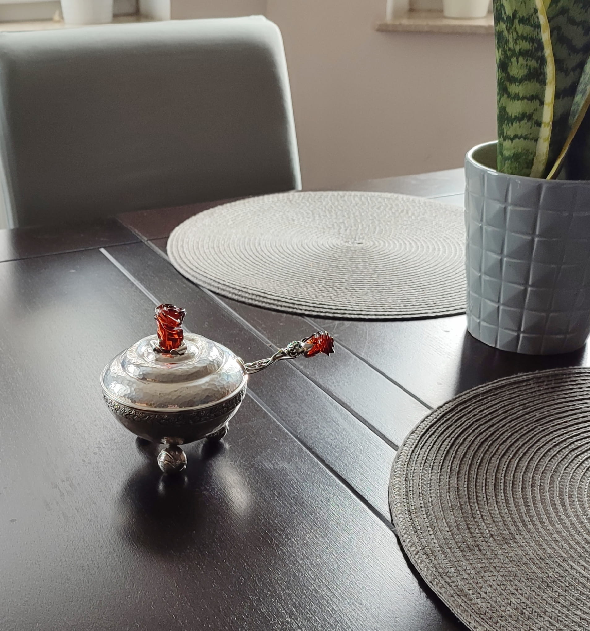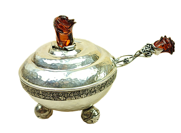 Oferujemy Państwu ręcznie wyrabianą w Gdańsku, ekskluzywną srebrną cukiernice w komplecie z łyżeczką zdobioną bursztynem bałtyckim.