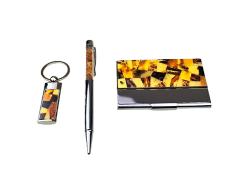 Oferujemy Państwu biznesowy zestaw upominkowy w skład którego wchodzi brelok, długopis i wizytownik. Wszystkie elementy zestawu są wykonane ze stali i zdobione naturalnym bursztynem bałtyckim.